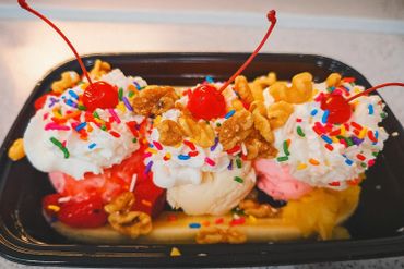 topped with hot fudge, whipped cream, sprinkles, pineapple, strawberries, bananas, , and a cherry