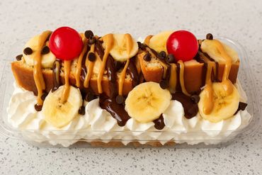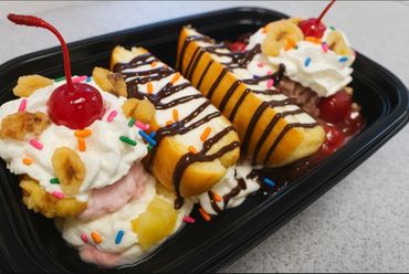 its a traditional banana split, but substituting the middle scoop with a donut bomb.